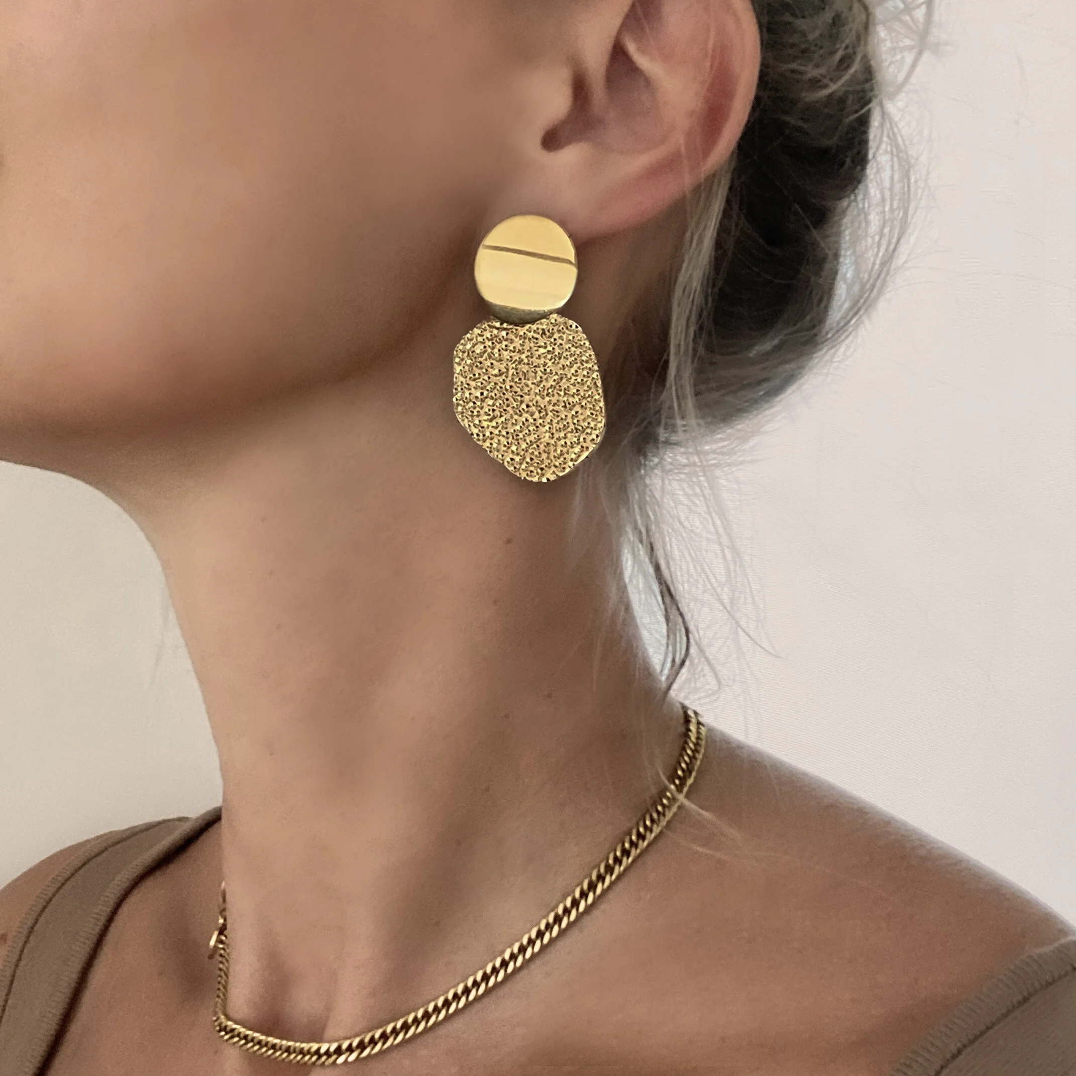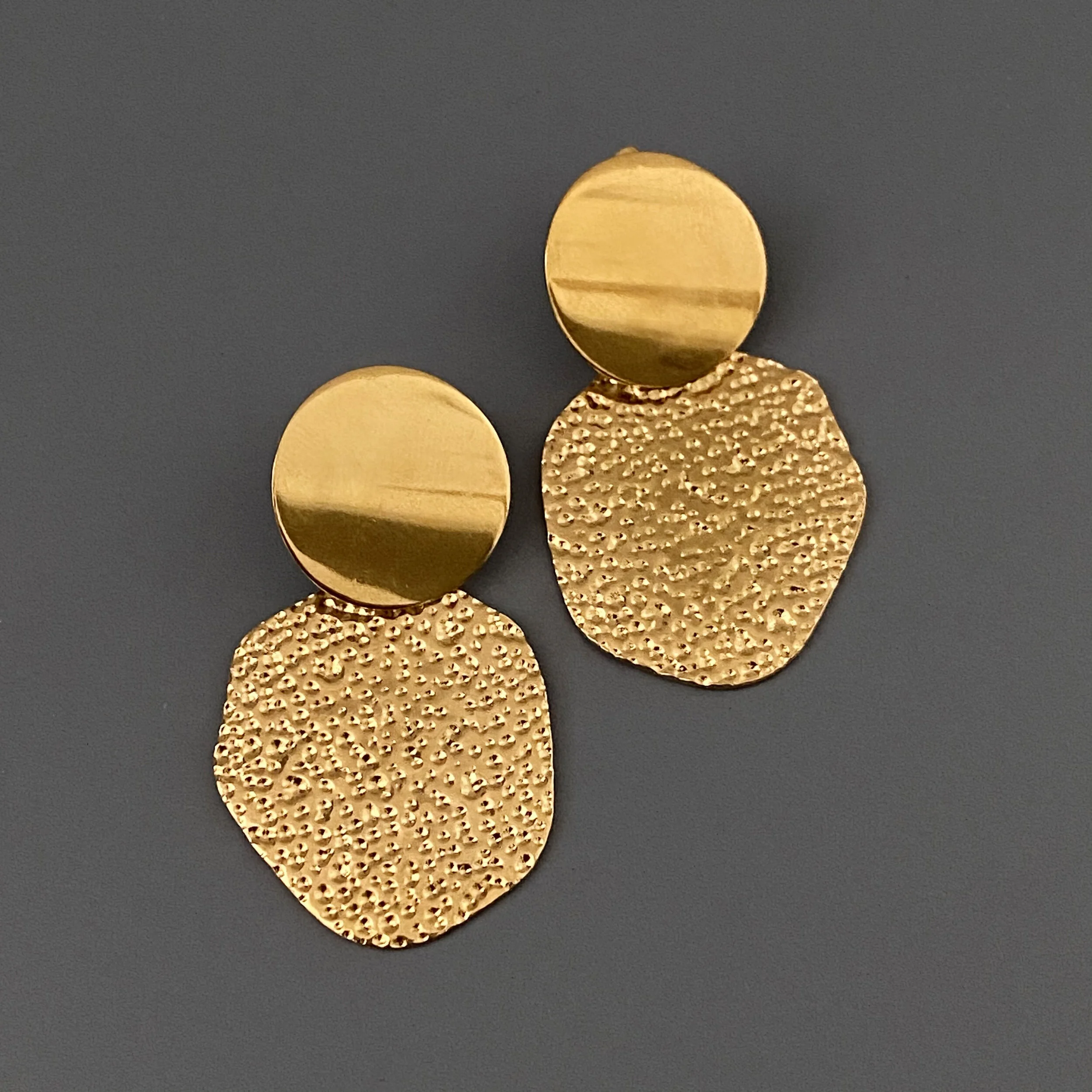 Stud disc earrings with large hammered pendants
